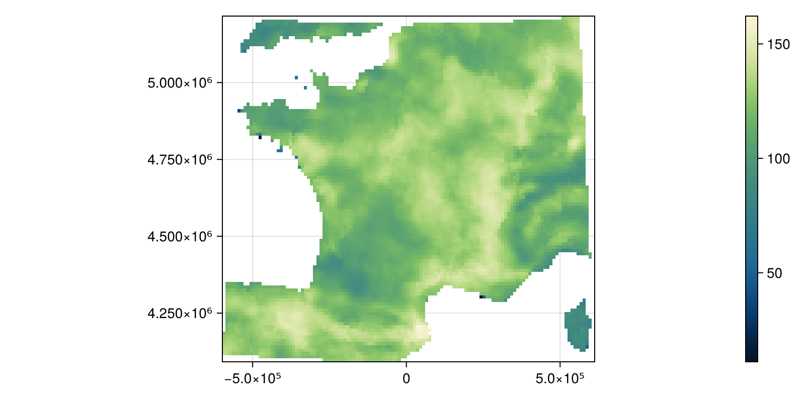 Colorbar(fig[:, end + 1], hm)And project them to the more locally appropriate EPSG:27574: