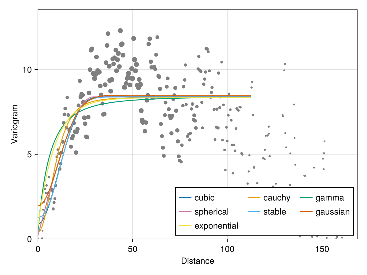 The family keyword (defaults to :gaussian) selects the type of variogram model to fit. Families of :gaussian, :spherical, :exponential, :linear, :cubic, and :hyperbolic only fit the range, nugget, and sill. Families of :gamma, :stable, :cauchy also fit a free parameter. Finally, :cardinalsine can be used to fit periodic variograms.