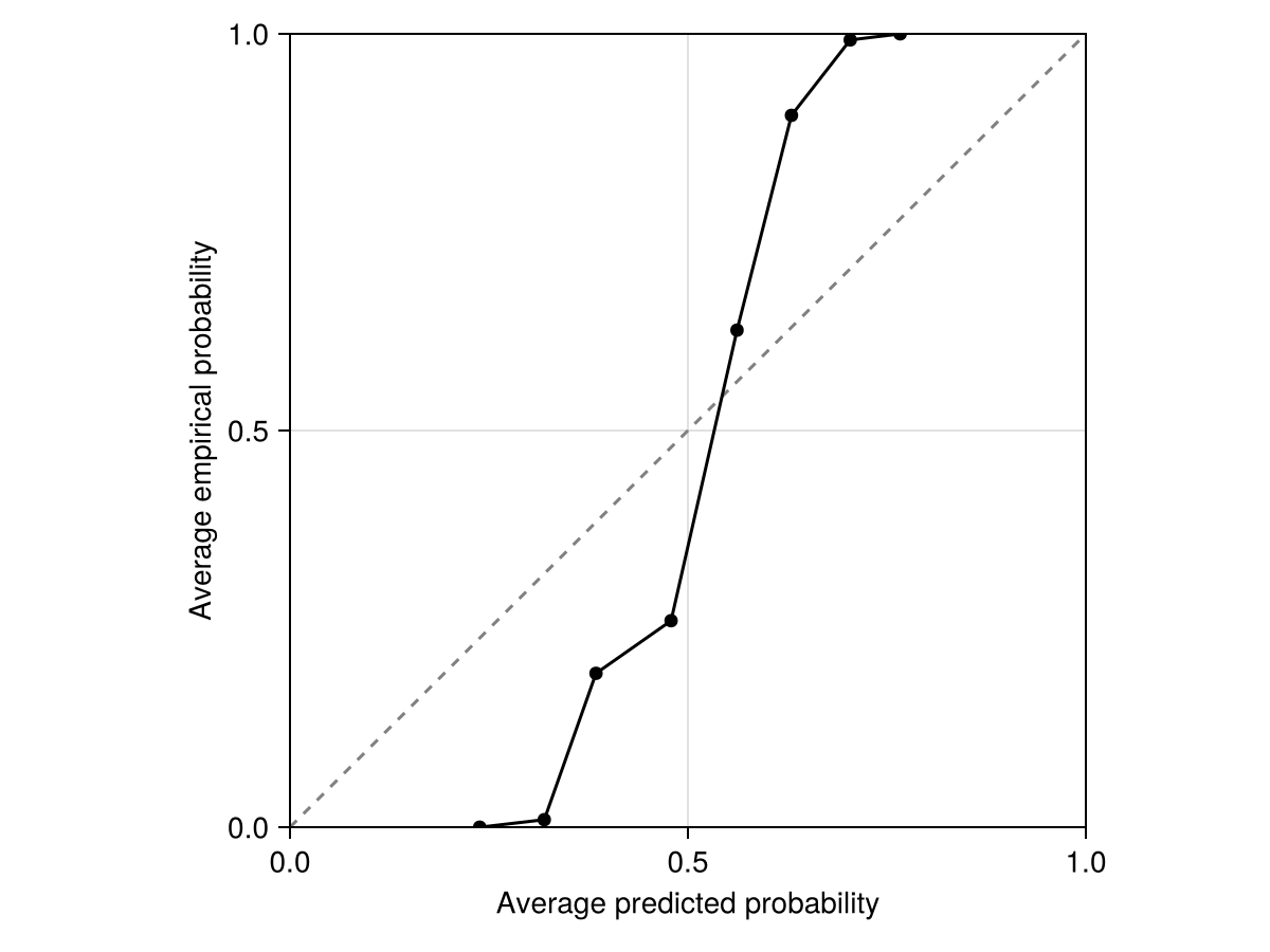 reliability(yhat, y; bins=9)Returns a binned reliability curve for a series of predicted quantitative scores and a series of truth values.
