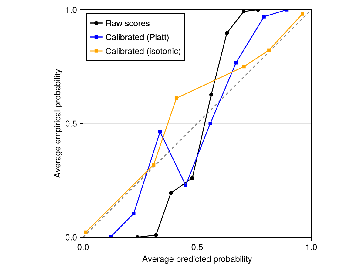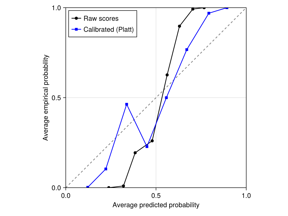 C = calibrate(bst)PlattCalibration(-8.763135276226246, 4.4798401313050595)This step uses the Platt (1999) scaling approach, where the outputs from the model are regressed against the true class probabilities, to attempt to bring the model prediction more in line with true probabilities (Niculescu-Mizil and Caruana, 2005). Internally, the package uses the fast and robust algorithm of Lin et al. (2007).