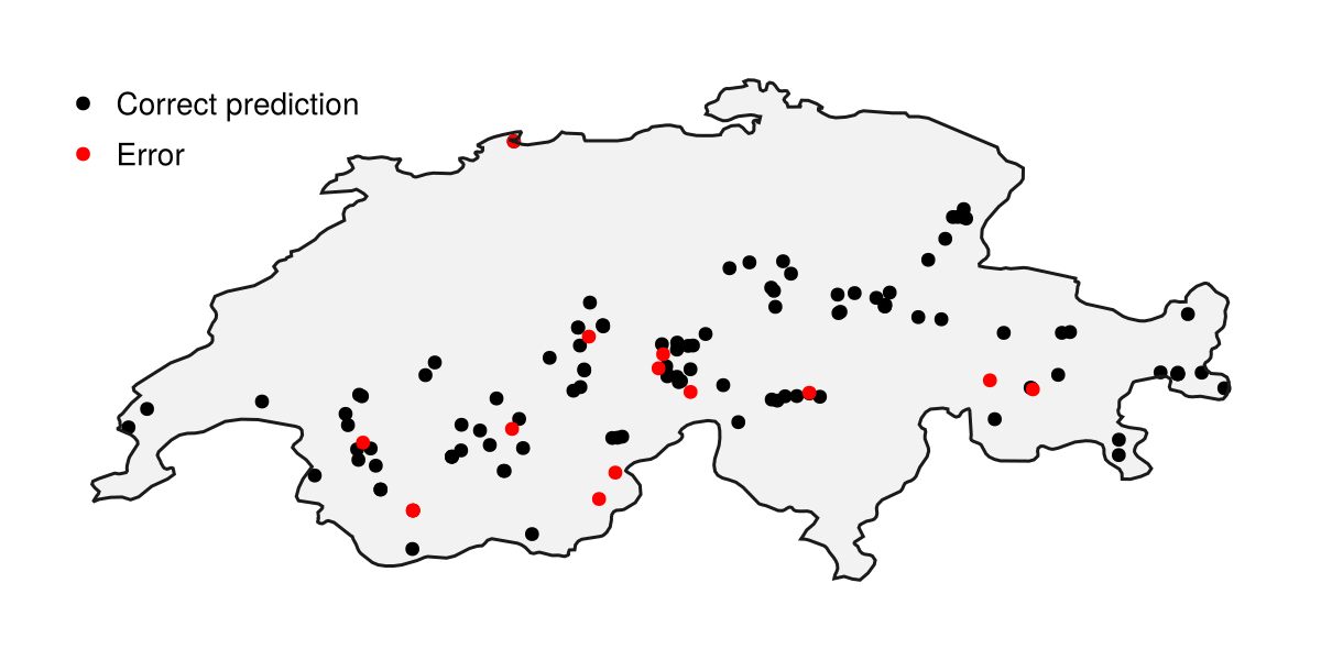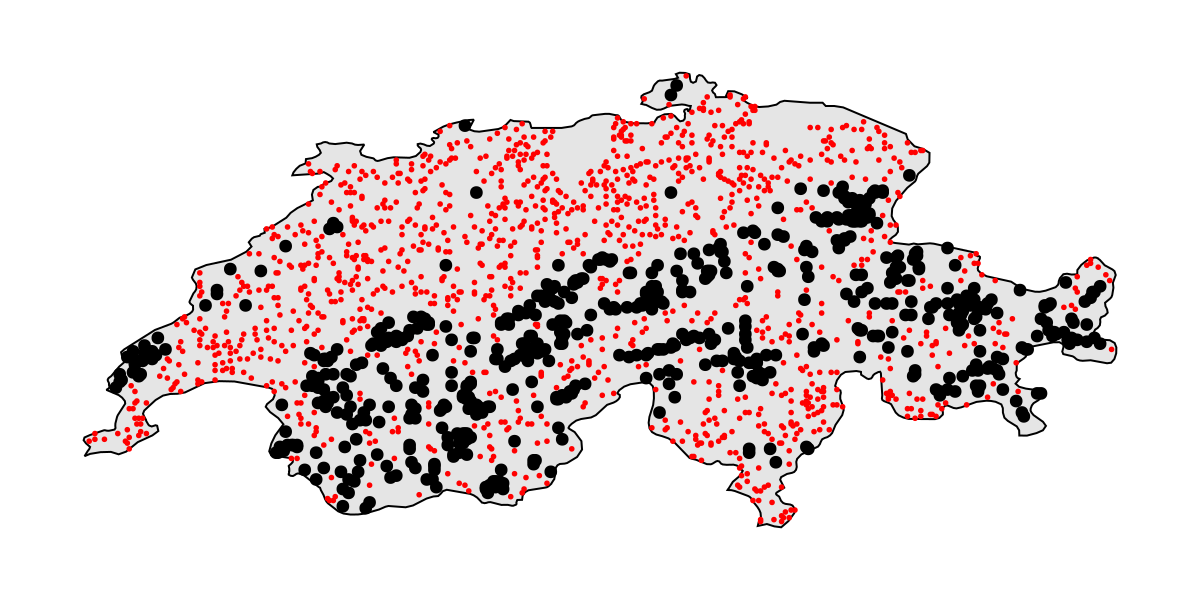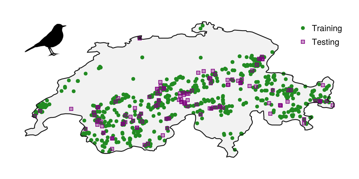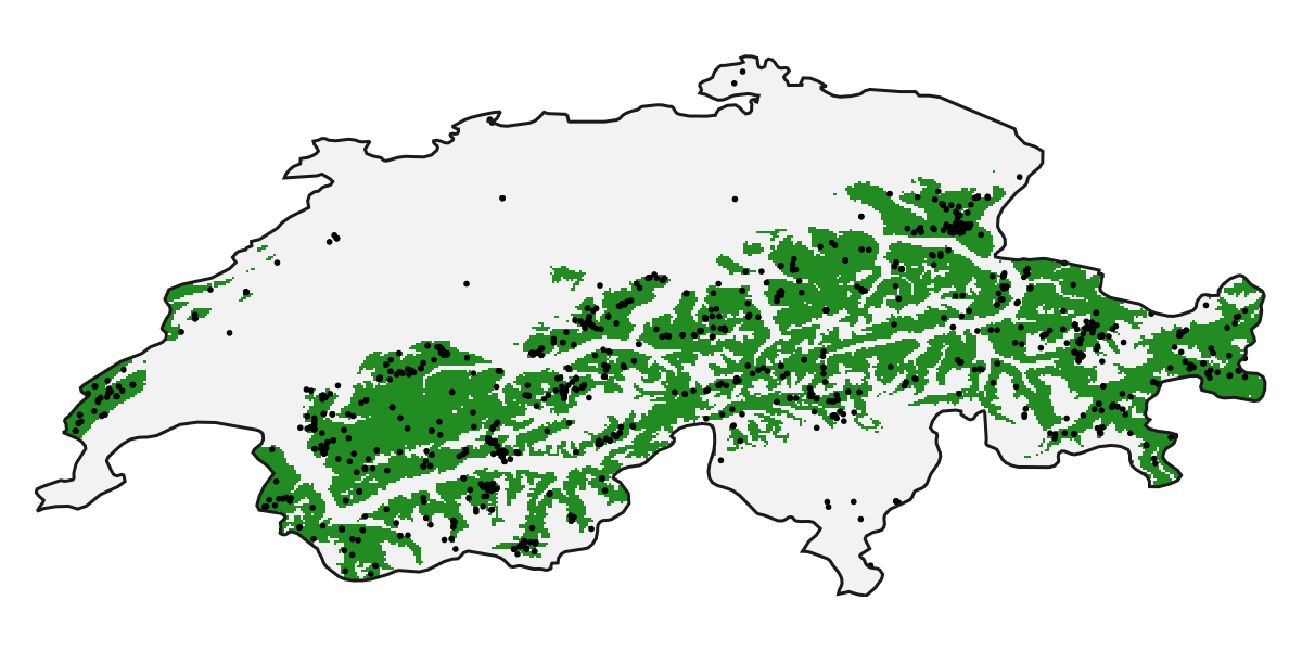 We will now grab a dataset from GBIF, which is a list of all observations of Turdus torquatus in Switzerland according to eBird. We will also grab a second dataset to test the model, which is the same species and country but uses iNaturalist data. Finally, we will get a representation of the