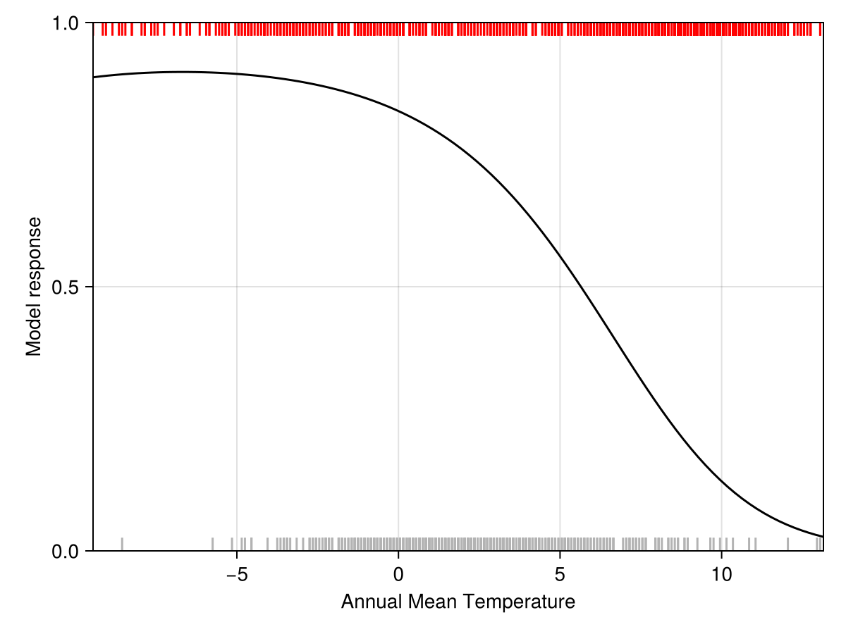 explainmodel(PartialResponse, model, variable, x; inflated=false, kwargs...)Returns the partial response of the model for a given variable, which is evaluated at all values given by x. The partial response is the prediction made using the given value of variable, when all other variables take the average value. When inflated is true, the response is measured against a randomly sampled value in the entire range of possible values for the other variables.