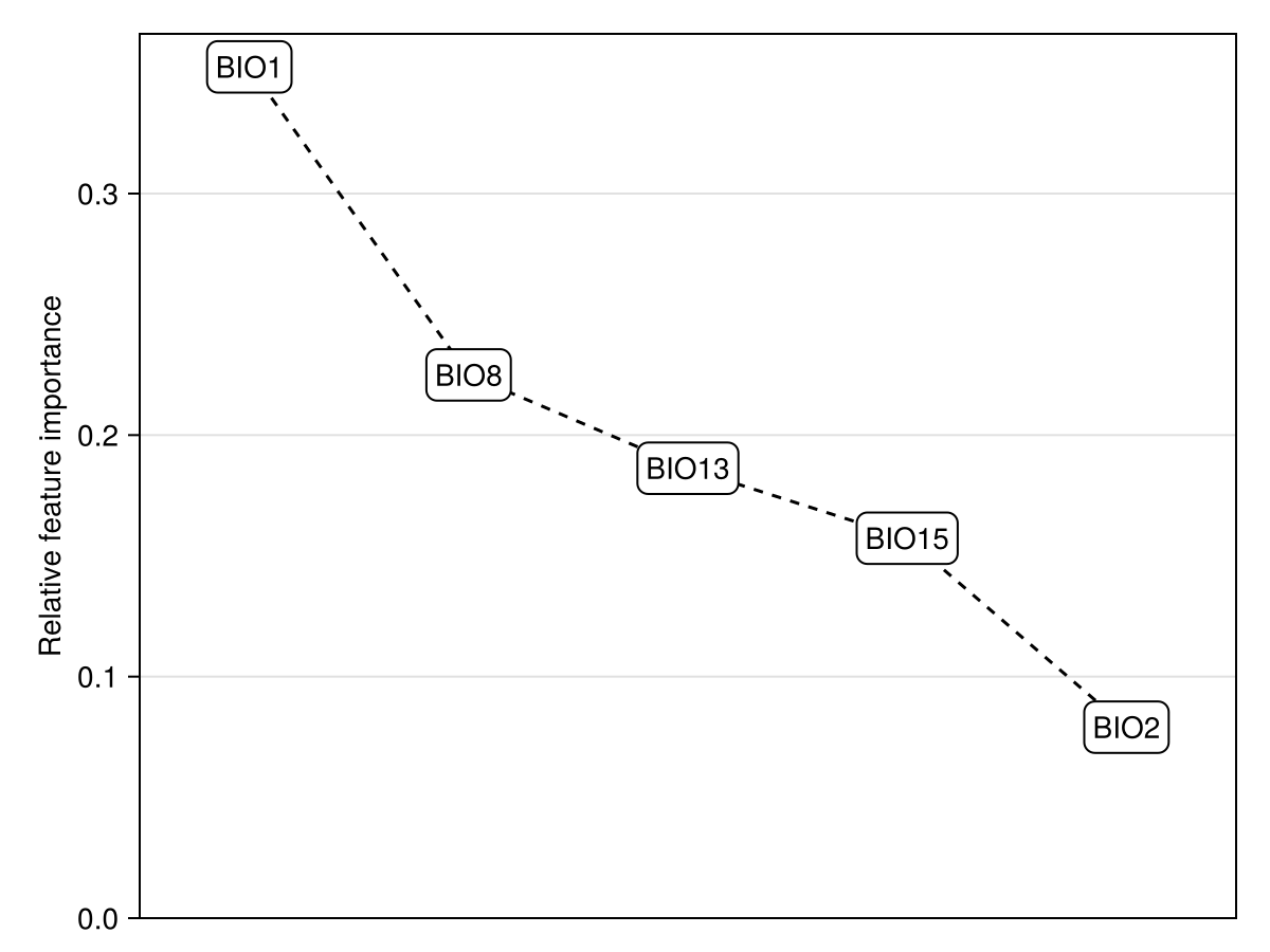featureimportance(PermutationImportance, model, variable, X, y; kwargs...)Returns the feature importance of a variable for a model by predicting over features X with a ground truth vector y .
