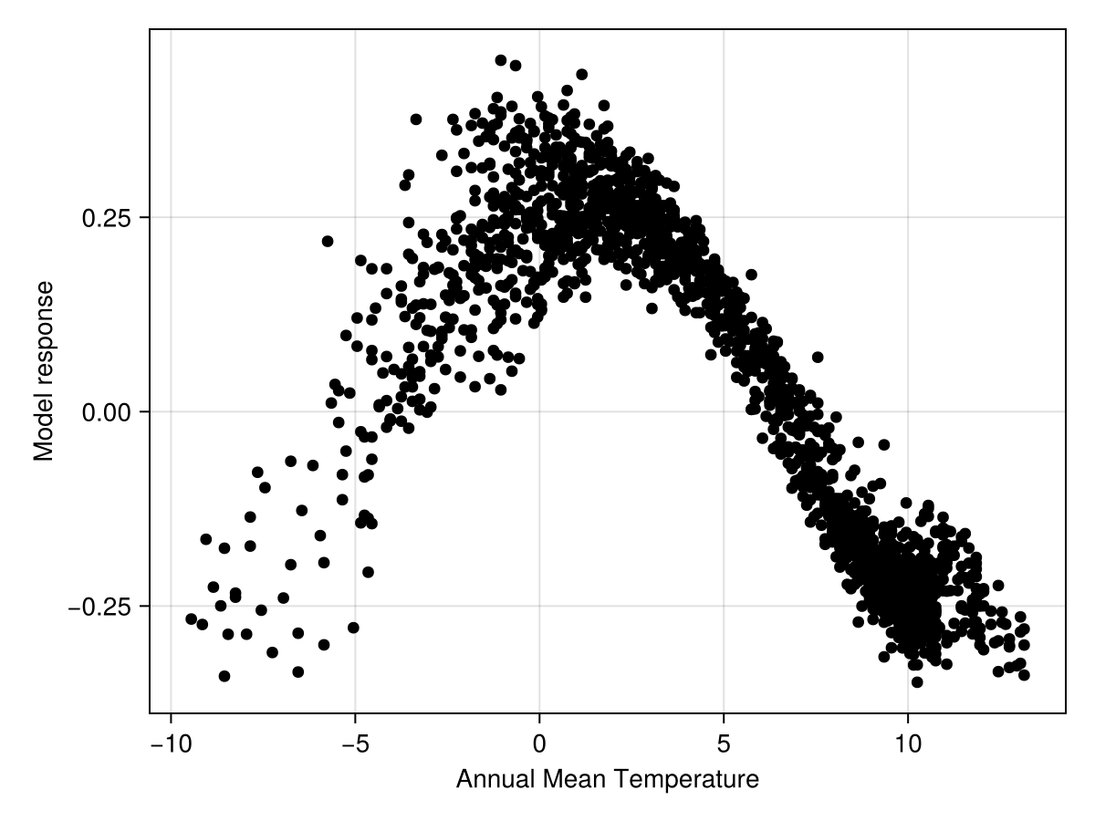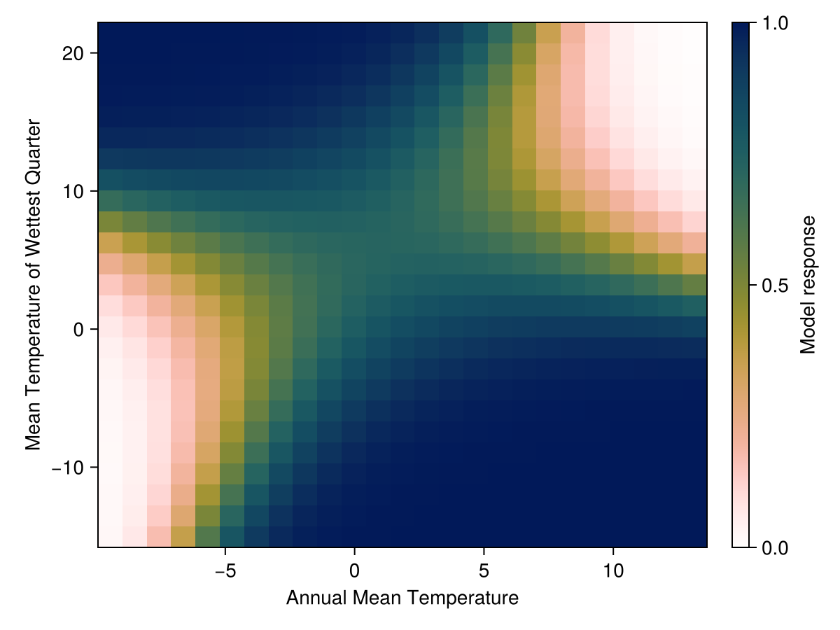 explainmodel(PartialResponse, model, variable, x, y; inflated=false, kwargs...)Returns the partial response of the model for a given pair of variable given as a tuple, which are evaluated at all values given by vectors x and y.