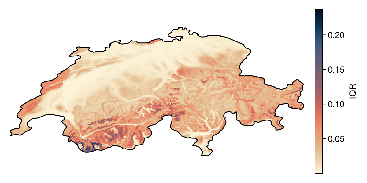 The SDMLayer function is the main constructor for layers (and can also read from STAC catalogues and local files). When given a RasterProvider, it will download (or open) the relevant files. Note that we are passing the area of interest (a polygon) as the second argument, so that the raster will only be returned within the boundingbox of this geometry.